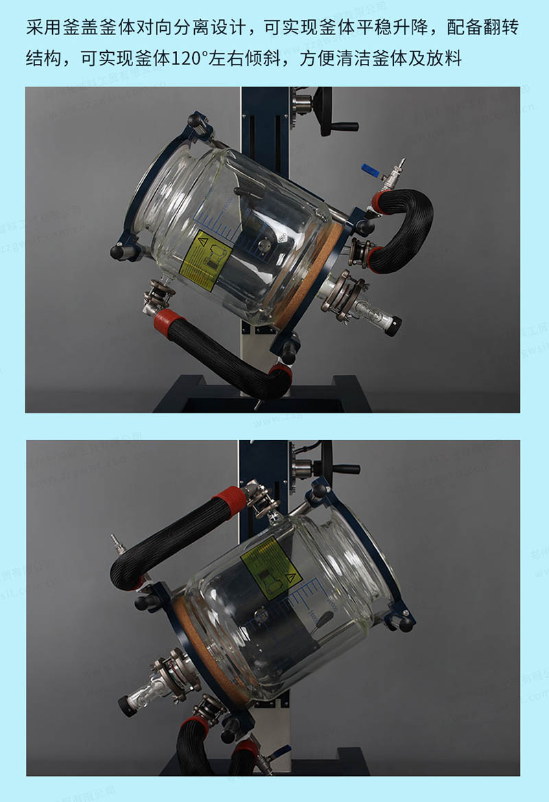20L升降式玻璃反應釜釜體與釜蓋分離,釜體可升降,亦可旋轉120°,便于加料和釜體清洗,玻璃件接口使用法蘭連接,且拆卸方便,用于化學、精細化工、生物制藥新材料合成等實驗、中試及生產。可與循環水式多用真空泵、隔膜真空泵、低溫循環器、恒溫循環器、密閉制冷加熱循環裝置等配套使用。